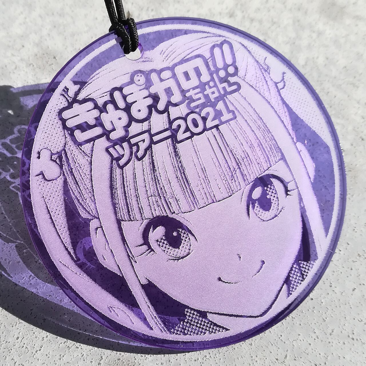 ※販売終了 透明アクリル板のタグです。 きゅぽかのちゃん!!ツアーの賞品の一つである表彰メダル(※1)と同じデザインとサイズ感で作りました。イベントの記念にどうぞ。 【本体色】クリアパープル 【サイズ】本体幅7cm/厚み3mm 【付属】黒ゴム (※1)開催地によります ※使用見本画像は2019年のものです(完売品) ※お使いのモニターにより写真の色味が実際の商品と異なる場合がございます。