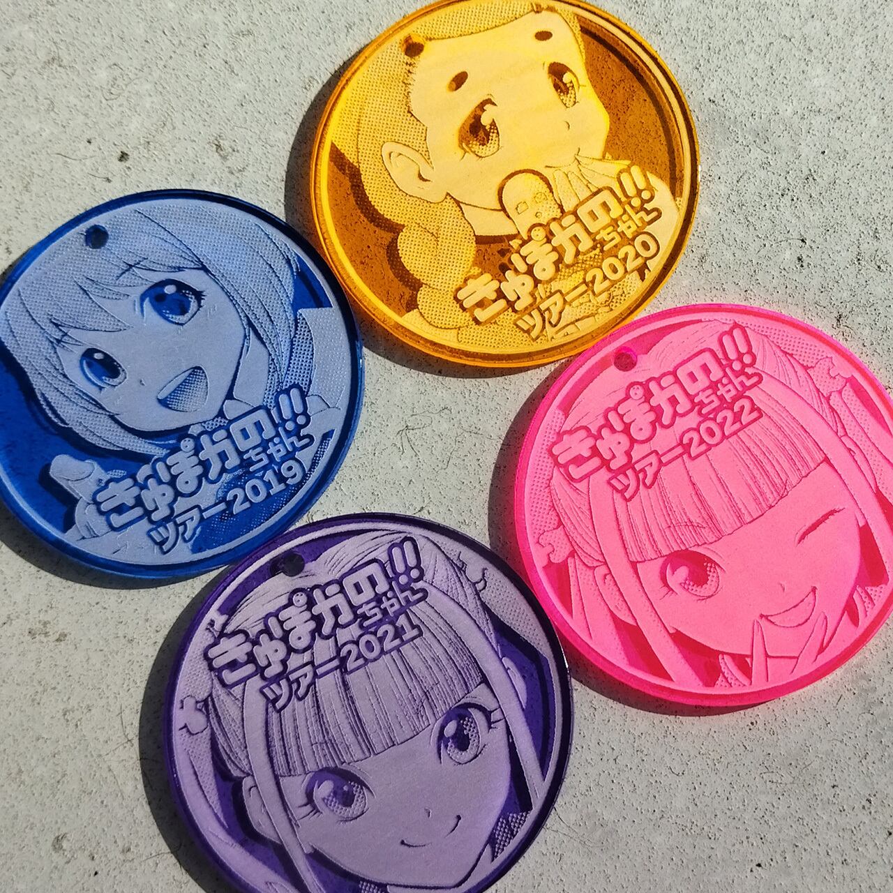 透明アクリル板のタグです。 きゅぽかのちゃん!!ツアーの賞品の一つである表彰メダル(※1)と同じデザインとサイズ感で作りました。イベントの記念にどうぞ。 【本体色】クリアグリーン 【サイズ】本体幅7cm/厚み3mm 【付属】黒ゴム (※1)開催地によります ※使用見本、その他のカラーは過去のものです(完売品) ※お使いのモニターにより写真の色味が実際の商品と異なる場合がございます。